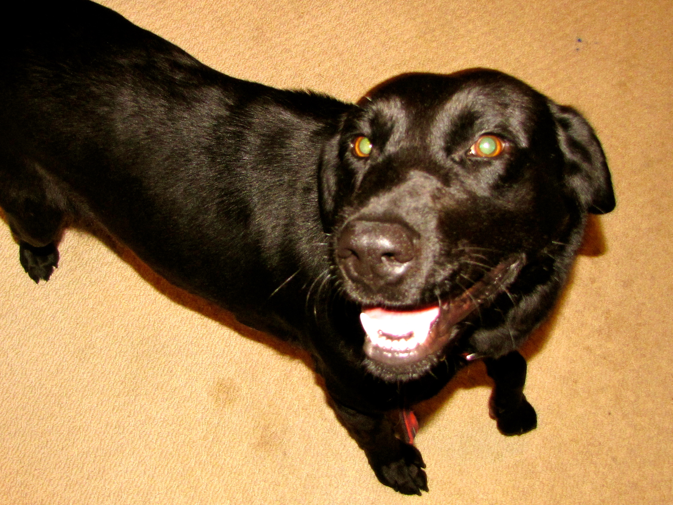 Apparently the head of a medium sized Labrador is small enough to fit through a 7″ x 5″ cat door. A cat door that leads into the garage. A garage where I put a bag of sealed garbage last night. T.P. had stuck her head through the door and had pulled almost the entire Hefty bag of garbage back into the house, piece by piece, and spread it all over the kitchen and den floor. The only things that she wasn’t successful at getting back into the house were items that were too big to fit through the small opening, like an orange juice bottle and some hamburger meat styrofoam trays. Other things that were too big to pull through, she chewed up and swallowed while her head was still protruding into the garage through the cat door.