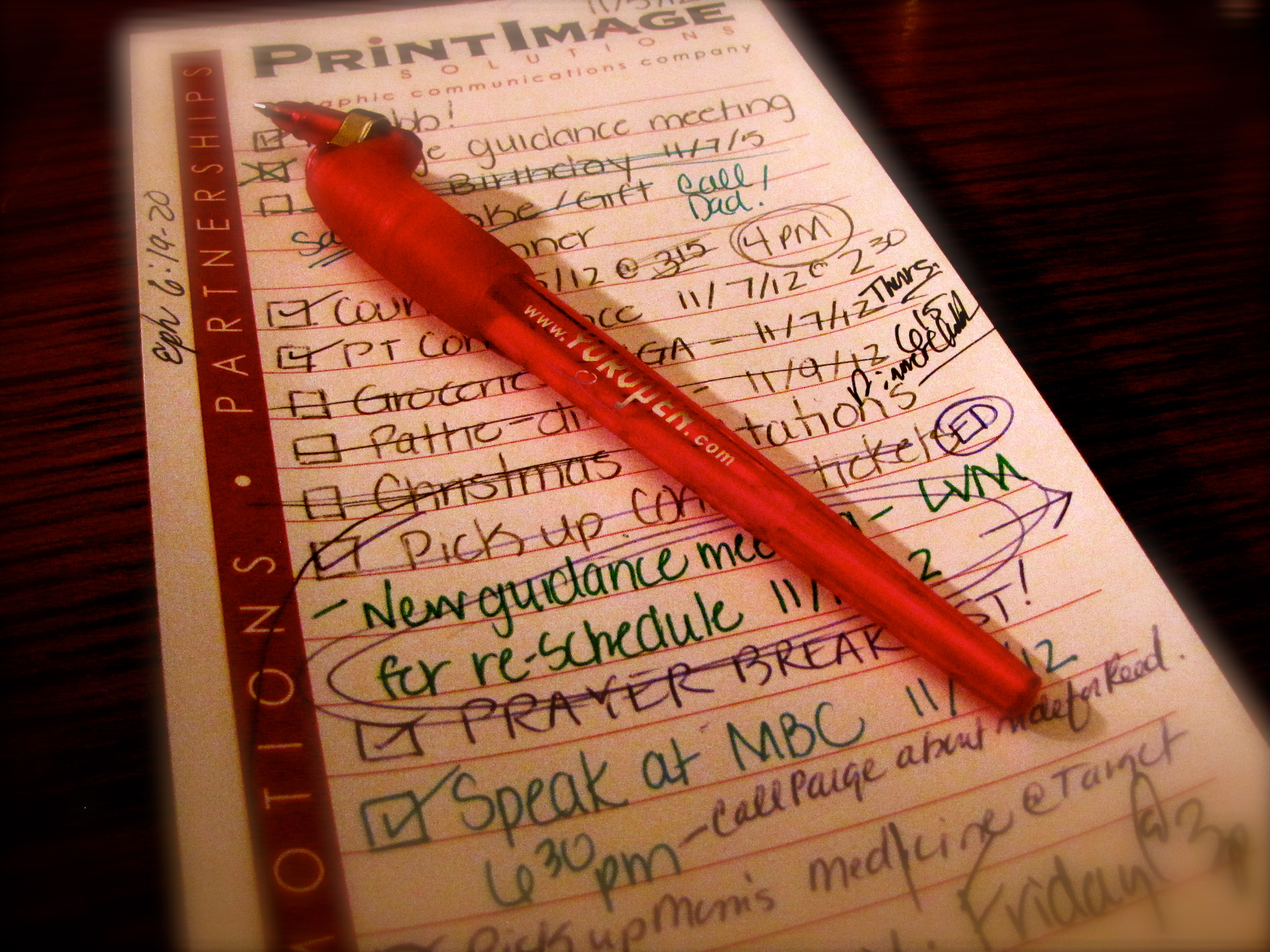 In reflecting on this past week, I notice that there are quite a few things that did not go as I had planned. Oh boy, do I like to plan things! I love making lists and checking them off as I complete tasks. At the end of the week, I can look at the list and “see” my productivity in the number of checked off boxes. My little self loves the tangible evidence that a list provides. Rarely, though, is the list completely checked off. And the list never stays as neat as when I first write it down. That’s because I have to add things and take things off the list. Often I have to edit items on the list. On Monday, the list is written in one color ink in print that is symmetrical and sparkly. By the end of the week, at least 2 more colors of ink have been used on this list, there are scribbled out and squeezed in words, and usually a lot of doodling can be seen around the edges. What a snapshot of life in general, isn’t it? I’m so thankful that even more than I can bank on my list changing from day to day, I know — hear me — I KNOW that I never need to worry about God’s faithfulness changing. When I start to freak out because my plans are not turning out the way I think they should, I take a deep breath and draw on the security of my Savior. My Constant. My Everlasting Balance. He is the same yesterday. He’ll be the same tomorrow. And right now, in the midst of my multi-colored, messy list, He is the same.
